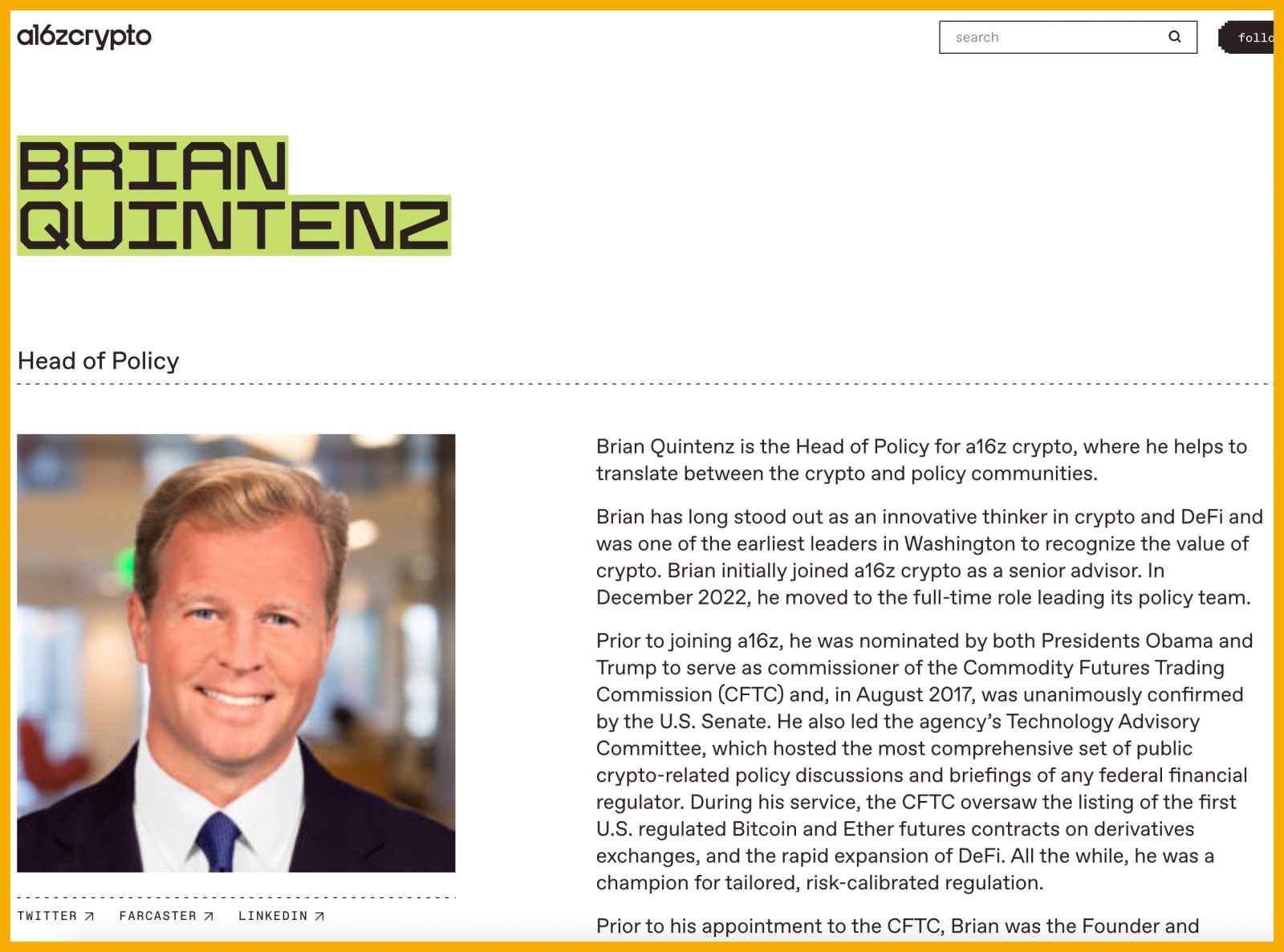 Các nguồn tin trực tiếp xác nhận rằng Tổng thống Trump đã chọn Brian Quintenz, hiện là Trưởng bộ phận Chính sách tại quỹ crypto a16z và là cựu ủy viên CFTC, để trở thành Chủ tịch chính thức của CFTC (Ủy ban Giao dịch Hàng hóa Tương lai).