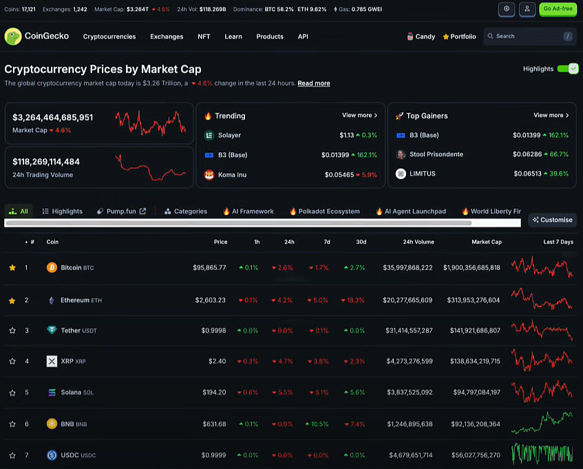 Bitcoin cũng giảm về quanh 95,000 USD. Hầu hết các altcoin điều chỉnh. Vốn hóa thị trường crypto cũng giảm về 3.26 nghìn tỷ USD.