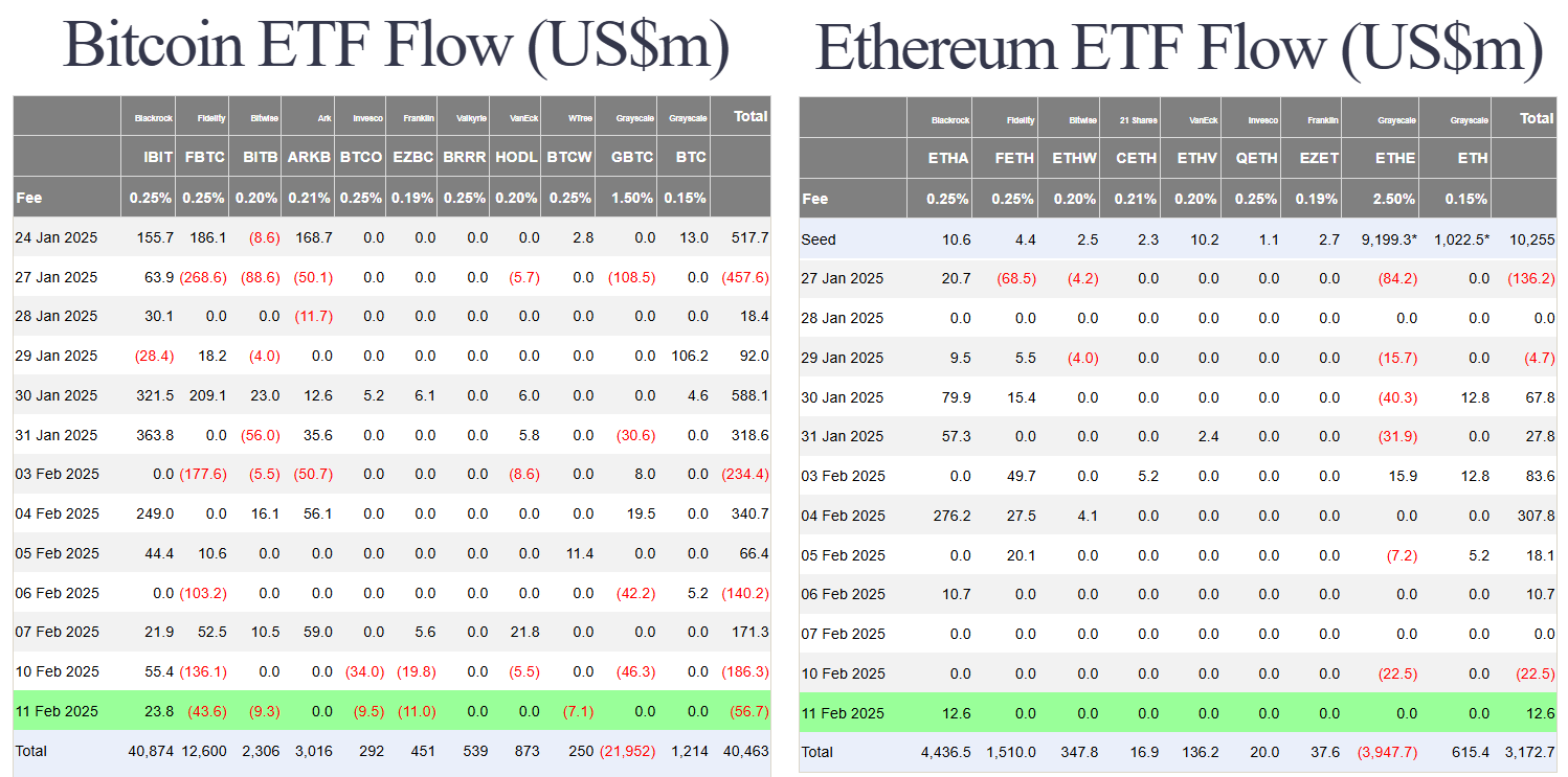 Các quỹ BTC spot ETF Hoa Kỳ ngày thứ ba (11/02) có dòng tiền rời khỏi 56.7 triệu USD. Trong đó, hầu hết các quỹ có dòng tiền rời khỏi, riêng IBIT của BlackRock vẫn có dòng tiền vào 23.8 triệu USD. Ngược lại, ETH spot ETF vẫn có dòng tiền vào dương 12.6 triệu USD đến từ quỹ ETHA của BlackRock.