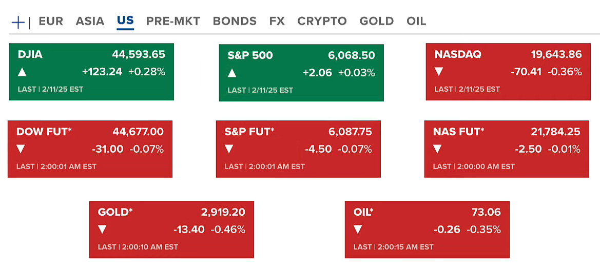 Chứng khoán Hoa Kỳ thứ ba (11/02-US) kết thúc phiên hai chỉ số Dow Jones và S&P 500 tăng nhẹ, còn Nasdaq giảm. Hợp đồng tương lai của chứng khoán nghiêng về xu hướng giảm nhưng không đáng kể. Dầu và vàng cũng điều chỉnh về 73 USD/thùng và 2919 USD/ounce.