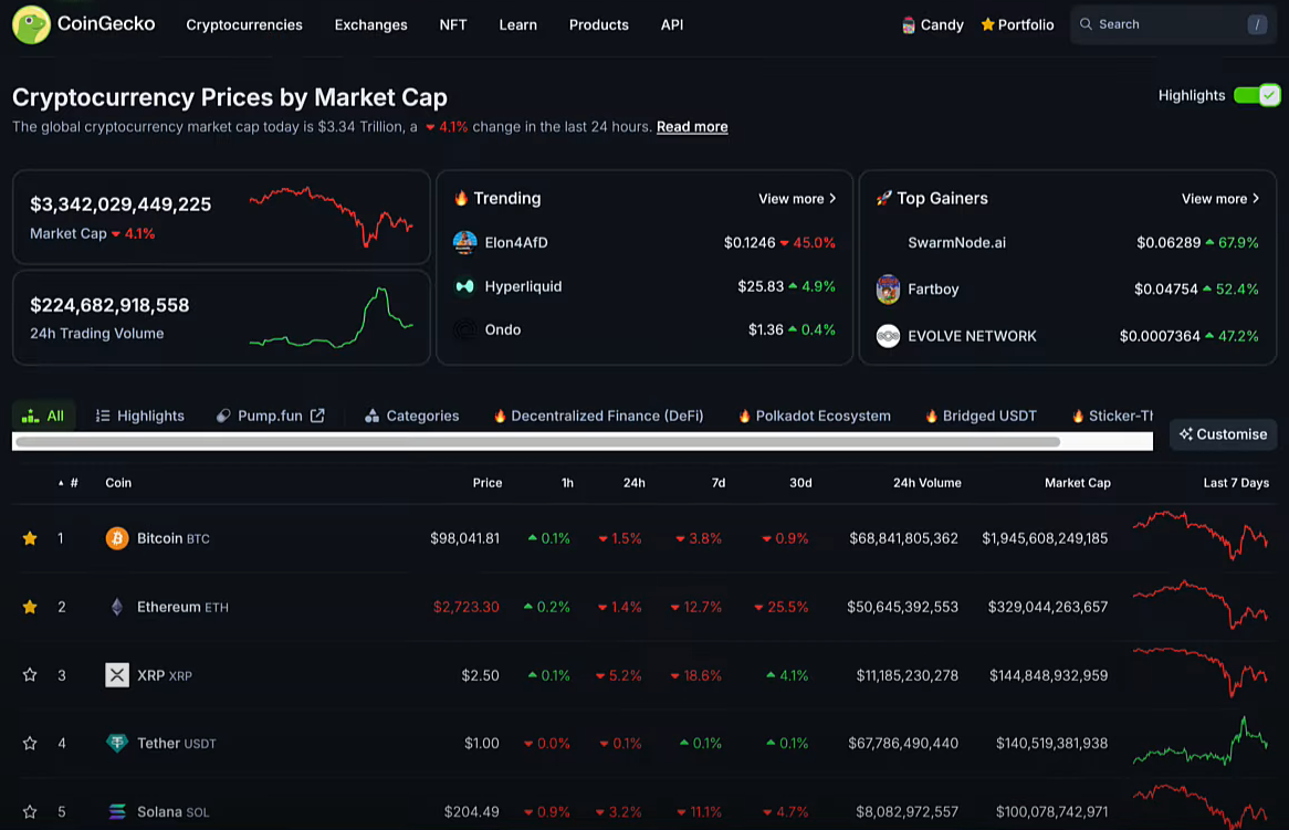 Ngày qua, dù có nhiều tin tốt nhưng thị trường vẫn phản ứng tiêu cực và crypto vẫn giảm. BTC đã giảm về 98,000 USD. Hầu hết altcoin đều giảm. Vốn hóa thị trường crypto là 3.34 nghìn tỷ USD.