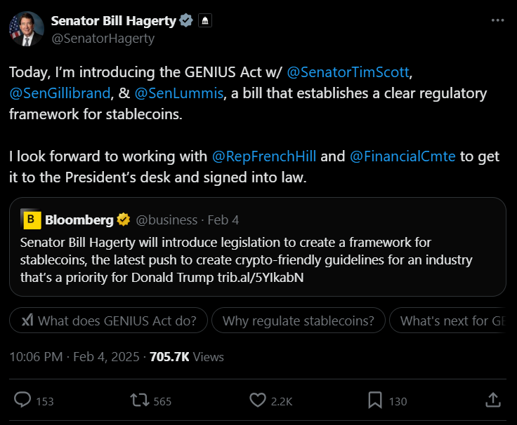 Thượng nghị sĩ Hoa Kỳ, Bill Hagerty đã đề xuất Đạo luật GENIUS (Guiding and Establishing National Innovation in U.S. Stablecoins), nhằm thiết lập khung pháp lý rõ ràng cho stablecoin tại Mỹ.