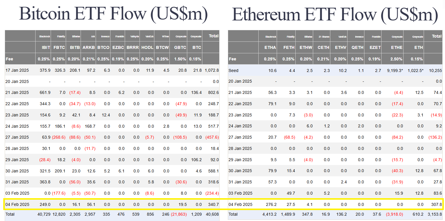 Các quỹ BTC spot ETF Hoa Kỳ thứ ba (04/02) đã có dòng tiền vào trở lại. Tổng dòng tiền vào các quỹ này đạt hơn 340 triệu USD. Còn ETh spot ETF cũng có dòng tiền vào rất lớn lên đến hơn 307 triệu USD.