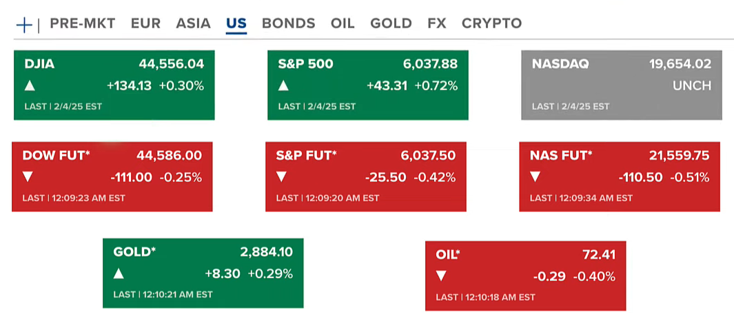 Chứng khoán Hoa Kỳ thứ ba (04/02-US) kết thúc phiên với sự tăng nhẹ ở hai chỉ số Dow Jones và S&P 500, Nasdaq không thay đổi. Chứng khoán biến động bởi thời điểm này nhiều công ty bắt đầu công bố báo cáo quý bốn. Còn giá hợp đồng vàng tăng lên 2884 USD/ounce. Dầu giảm về 72 USD/thùng.