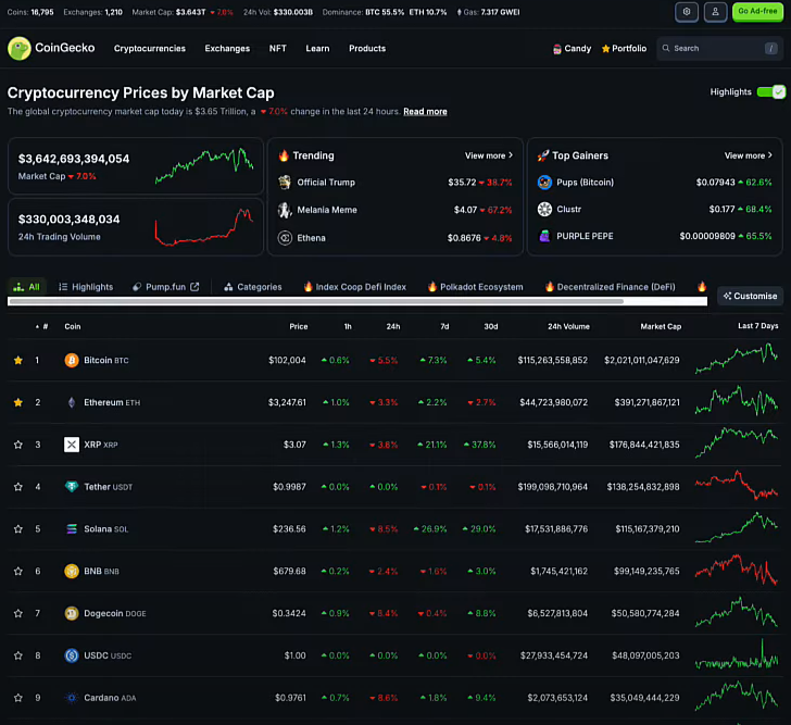 Bitcoin sau khi đạt đỉnh mới trên 109,000 USD đã điều chỉnh nhẹ về quanh 102,000 USD. Các altcoin lớn cũng giảm đáng kể. Vốn hóa thị trường crypto là 3.642 nghìn tỷ USD.