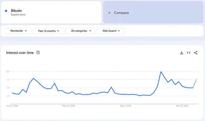 Việc tổng thống Trump ủng hộ crypto và phát hành memecoin đã khiến cho thị trường crypto sôi động trở lại. Dấu hiệu là số lượt tìm kiếm “Bitcoin” trên Google trend đã tăng đáng kể. Đây là hiệu ứng thường thấy khi thị trường sôi động trở lại.