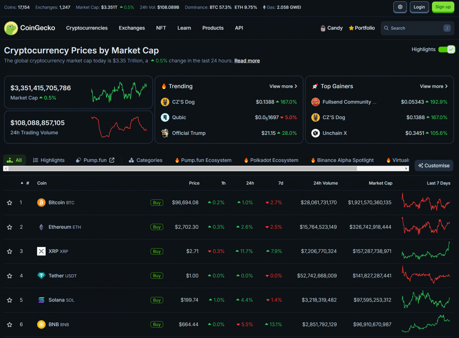Bitcoin thì quanh 96,600 USD. Vàng đã đạt đỉnh mới và S&P 500 cũng tiếp tục tăng mạnh, thị trường cũng chờ đợi đến thời điểm tăng của BTC. Các altcoin top vẫn tăng trong ngày. Vốn hóa thị trường crypto ở quanh 3.35 nghìn tỷ USD.