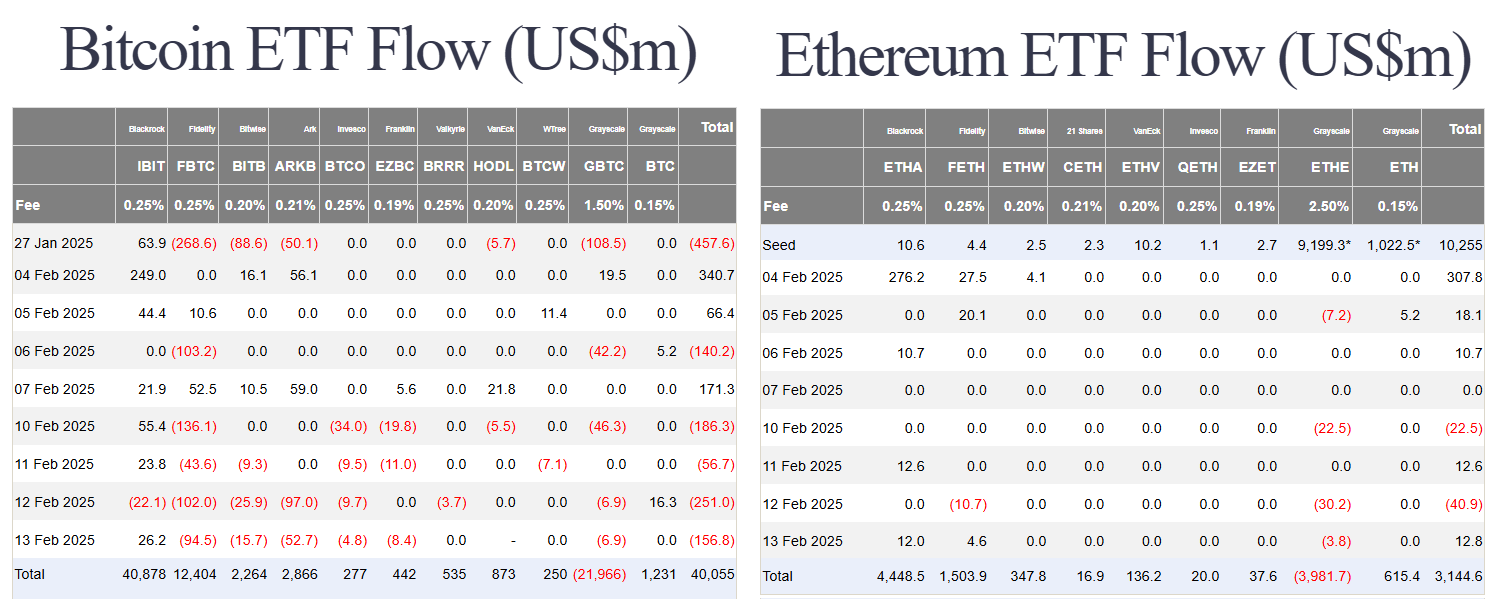 Các quỹ BTC spot ETF Hoa Kỳ thứ năm (13/02)tiếp tục có dòng tiền rời khỏi là 156 triệu USD. Trong đó, hầu hết các quỹ có dòng tiền rời khỏi trừ quỹ IBIT của BlackRock. Còn các quỹ ETH spot ETF vẫn có dòng tiền vào dương 12.8 triệu USD.