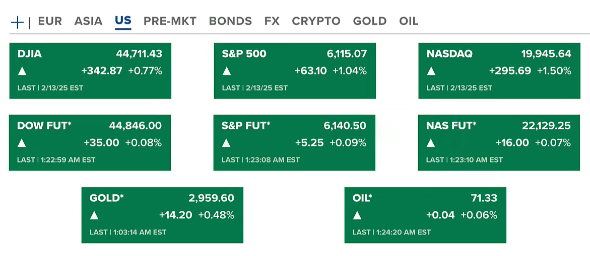 Chứng khoán Hoa Kỳ phiên thứ năm (13/02-US), cả ba chỉ số đều kết thúc phiên tăng, riêng Nasdaq tăng nhiều nhất 1.5%. Hợp đồng tương lai của chứng khoán cũng là xu hướng tăng. Không ngoại lệ, vàng và dầu đều tăng lên lần lượt là 2959 USD/ounce và 71 USD/thùng.