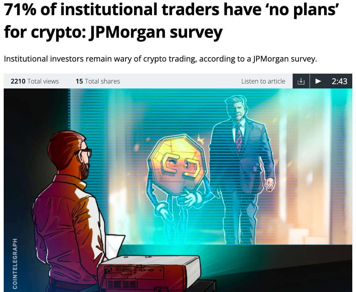 Theo khảo sát của JPMorgan, 71% nhà đầu tư tổ chức không có kế hoạch giao dịch crypto trong năm 2025 (giảm nhẹ so với 78% năm trước), chỉ 16% dự định tham gia và 13% đã giao dịch. Họ chủ yếu lo ngại rủi ro vĩ mô như lạm phát và thuế quan, dù quy định pháp lý tại Mỹ dần “dễ thở” hơn.