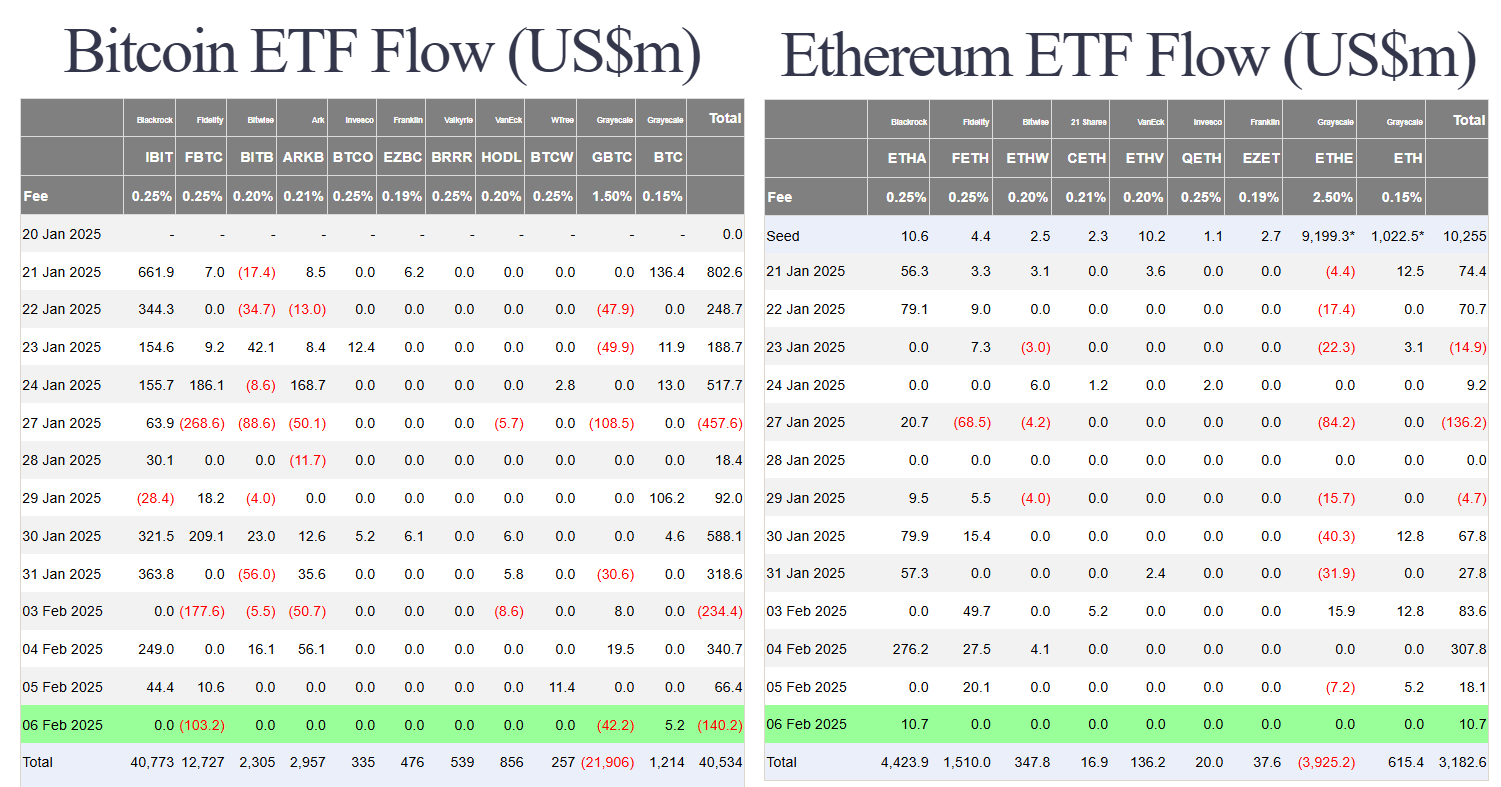 Các quỹ Bitcoin spot ETF Hoa Kỳ thứ năm đã có dòng tiền ra là 140.2 triệu USD. Dòng tiền rời khỏi đến từ hai quỹ FBTC và GBTC, các quỹ còn lại có dòng tiền bằng không. Ngược lại, ETH spot ETF vẫn tiếp tục có dòng tiền vào dương 10.7 triệu USD và đến từ quỹ ETHA của BlackRock.