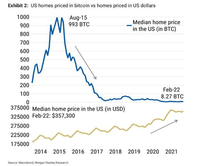Khi đánh giá sự gia tăng giá trị của bất động sản, chúng ta không chỉ so sánh với đồng USD mà cần xem xét sự tăng trưởng so với các loại tài sản khác. Ví dụ, nếu quy đổi giá một căn nhà sang Bitcoin, bạn sẽ nhận thấy rằng theo thời gian, số lượng Bitcoin cần để mua một căn nhà có xu hướng giảm. Điều này phản ánh bản chất của đầu tư và sự quan trọng của việc bảo toàn giá trị tài sản.