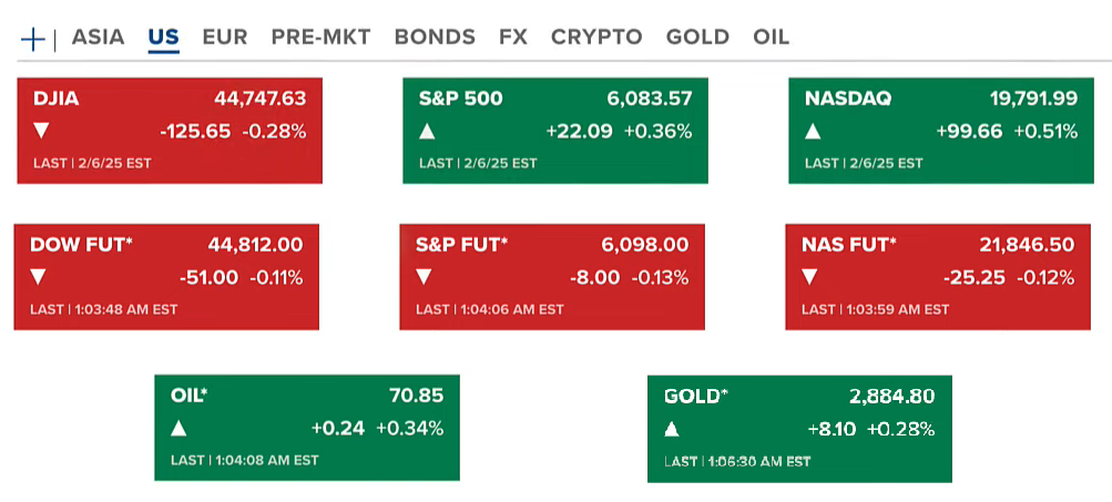 Chứng khoán Hoa Kỳ thứ năm (06/02) kết thúc với Dow Jones giảm 0.28%, S&P 500 và Nasdaq đều tăng. Hợp đồng tương lai của chứng khoán cho thấy xu hướng giảm. Hợp đồng vàng và dầu có tăng nhẹ lên quanh 2884 USD/ounce và 70.8 USD/thùng.