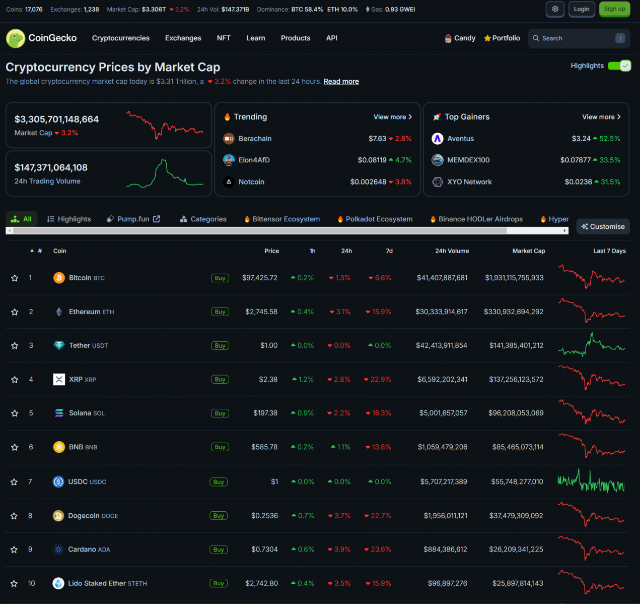 Giá Bitcoin ngày qua giảm nhẹ về 97,400 USD, mức giảm này rất nhỏ so với lịch sử giảm của BTC. Tuy nhiên, nhiều altcoin tiếp tục giảm mạnh và giảm đáng kể trong một tuần qua. Vốn hóa thị trường crypto giảm về 3.305 nghìn tỷ USD.