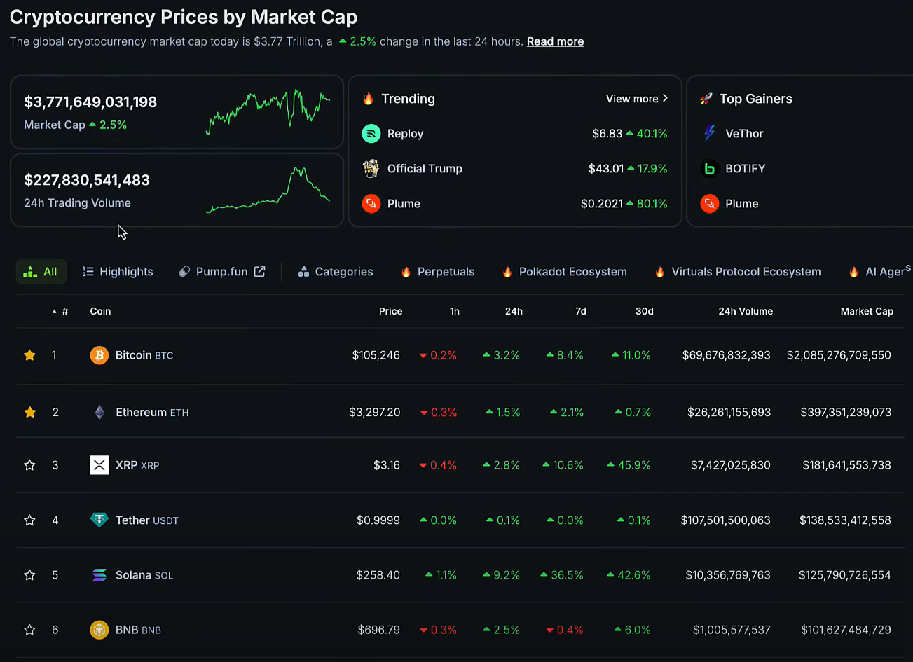 Bitcoin ở quanh mức 95,000 USD ở thời điểm Thuận chia sẻ. Hầu hết altcoin lớn đều tăng. Riêng SOL đã tăng hơn 9%. Vốn hóa thị trường crypto là 3.77 nghìn tỷ USD.