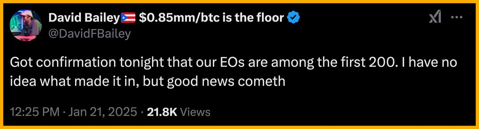 David Bailey, CEO của Bitcoin Magazine, cũng cho biết ông đã nhận được xác nhận rằng các sắc lệnh hành pháp liên quan đến crypto nằm trong số 200 sắc lệnh đầu tiên được Tổng thống Trump ký. Các sắc lệnh hành pháp này đang được xử lý tuần tự, từng bước theo thứ tự ưu tiên do đội ngũ của Trump sắp xếp.