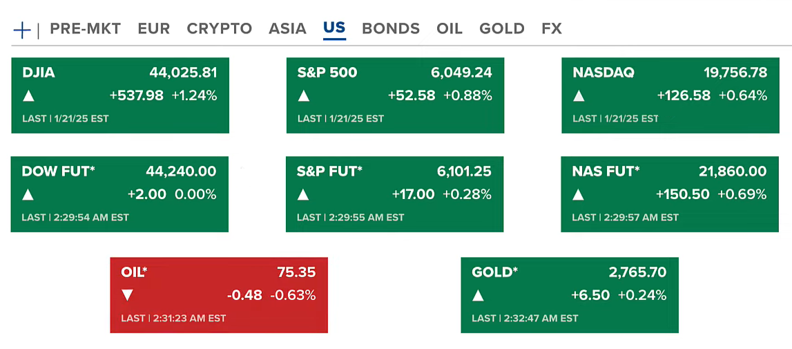 Thị trường đã phục hồi sau khi tổng thống Trump nhậm chức. Chứng khoán Hoa Kỳ thứ ba (21/01) đã tăng ở cả ba chỉ số, với Dow Jones tăng mạnh nhất 1.24%. Hợp đồng tương lai của chứng khoán cũng tăng nhẹ. Hợp đồng vàng tăng lên 2765 USD/ounce. Dầu giảm về 75 USD/thùng.